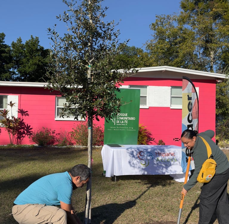 This project has been made possible through Hispanic Access Foundation (HAF), whose Nuestros Bosques initiative is funded by the USDA Forest Service; Biofilia, an environmental design and ecological firm whose expertise has informed species selection, canopy design, and ecological integration; Corpus Care, a clinical and wellness collaborator connecting the reforestation work to broader health pathways for participating families; Bliss Health, our partner on the BCF (Bosque Comunitario de la Fe) project beginning in April 2026 with the "Planting for Life: Clean Air, Stronger Communities" initiative; and Observatorio Ambiental Hispano, Inc., which provided support in an earlier phase of the project on community environmental engagement.